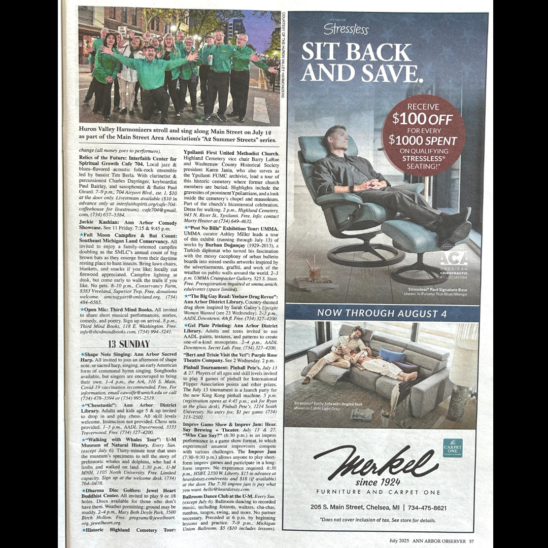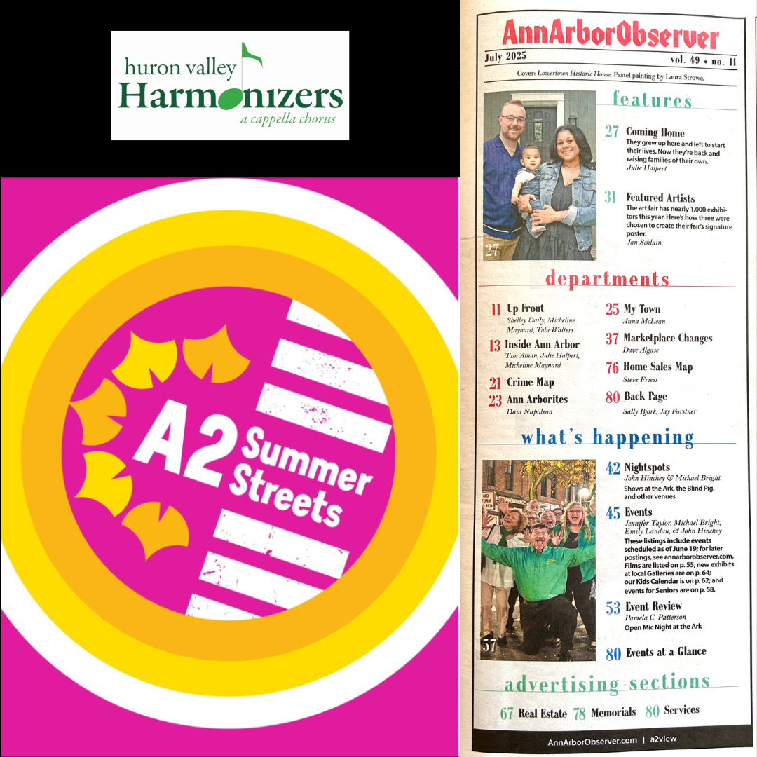 | Hey, hey, hey! We're in July's Ann Arbor Observer! Check us out on pages 9 and 57! We'll be back singing and strolling for Main Street Ann Arbor's Summer Streets celebration on Saturday, July 12, from 7 - 9 pm. Find us by listening for our cool harmonies! ![]() |